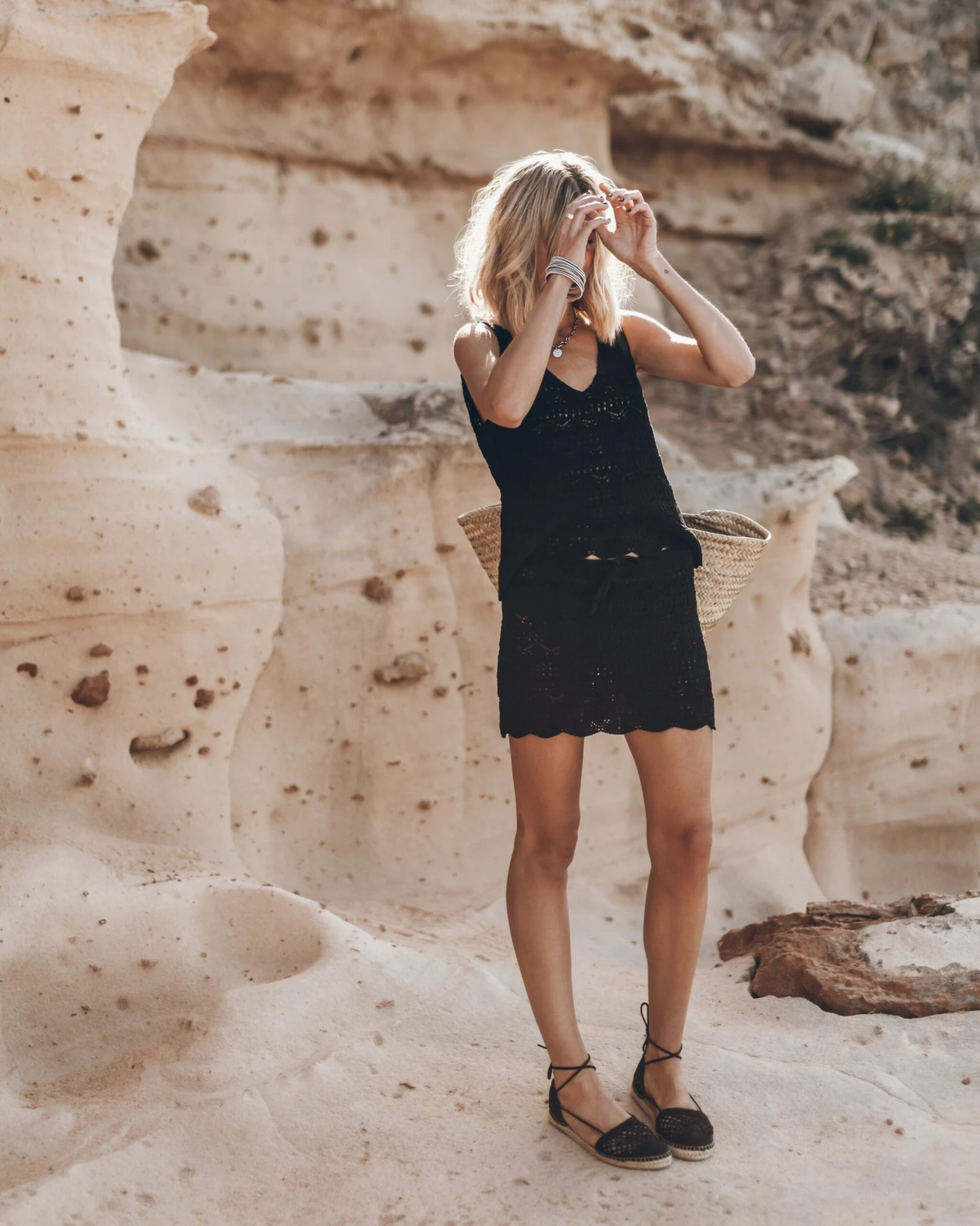 Enter bohemian bliss with our nostalgic and timeless crochet tank. Crafted in a thick, breathable linen blend, the black crochet tank can go everywhere with you, perfect for layering over your favorite swimsuit or dressing up with strappy sandals for an evening out. The hook crochet detailing adds a touch of artisanal charm while still allowing for extra skin contact with the elements.