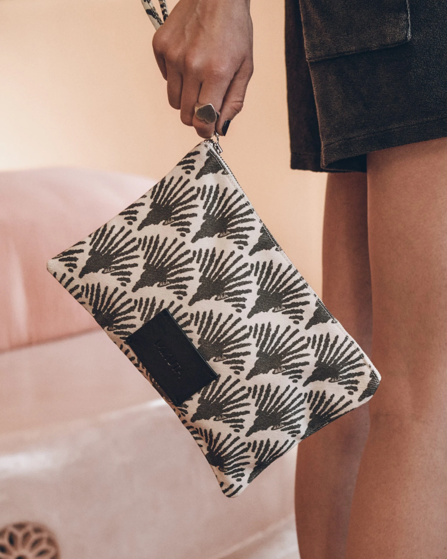 Small canvas pouch in millennial pink print with zipper closure and wrist strap.