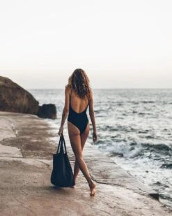 Black structured swimsuit with low back and adjustable shoulder straps.