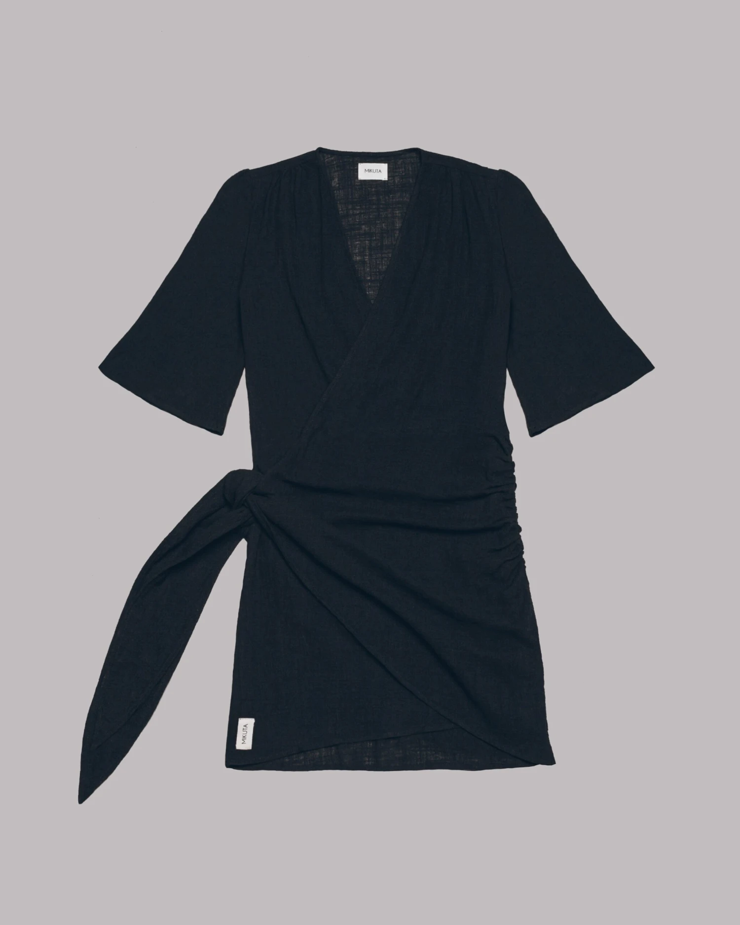 Easy breezy wrap dress in black made of cotton gauze. The dress has double layers on the back and in front under the waist and is being knotted on the side.
