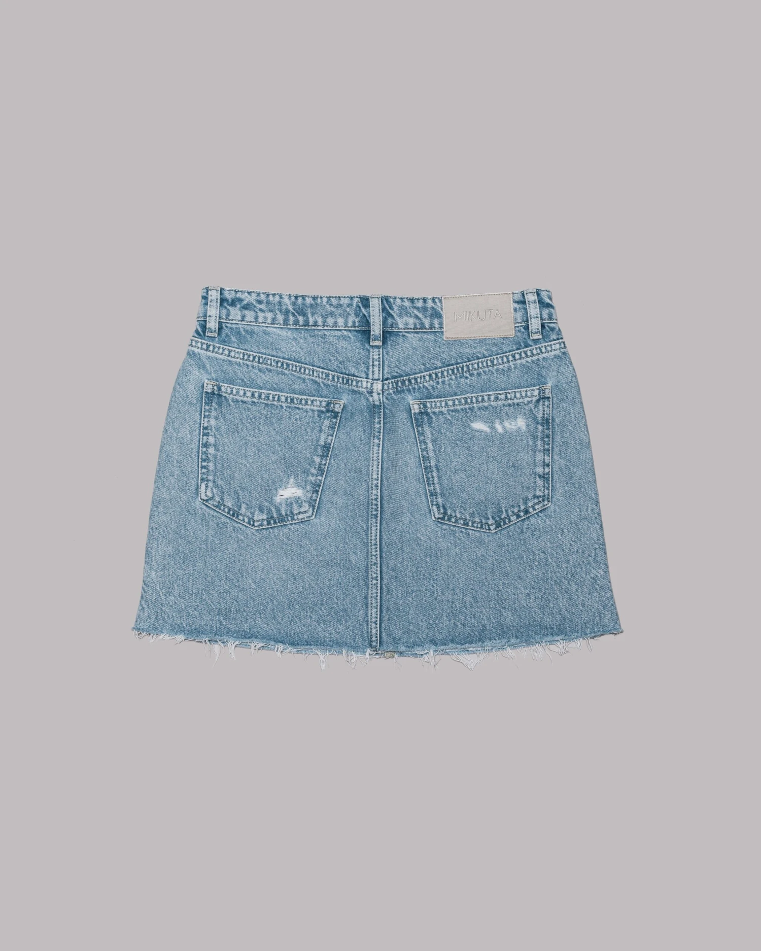 Blue vintage look denim skirt with raw hem, ripped details and small slits on the sides. Has two pockets in the front and two in the back.