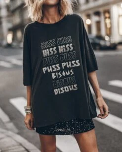 Loose long cotton/lyocell T-shirt in faded black with a Kiss print on the chest.