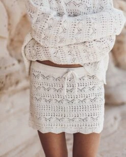 Enter bohemian bliss with this nostalgic and timeless crochet skirt. Crafted in a thick, breathable linen blend, the ecru mini-skirt is made extra-durable to travel everywhere with you, perfect for layering over your favorite swimsuit or dressing up with strappy sandals for an evening out. The hook crochet detailing adds a touch of artisanal charm while still allowing for extra skin contact with the elements.