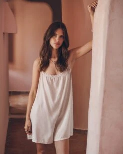 Short and flowy jumpsuit in light grey/beige with hidden pockets on the sides, low back and ruffle details on the upper front and back.