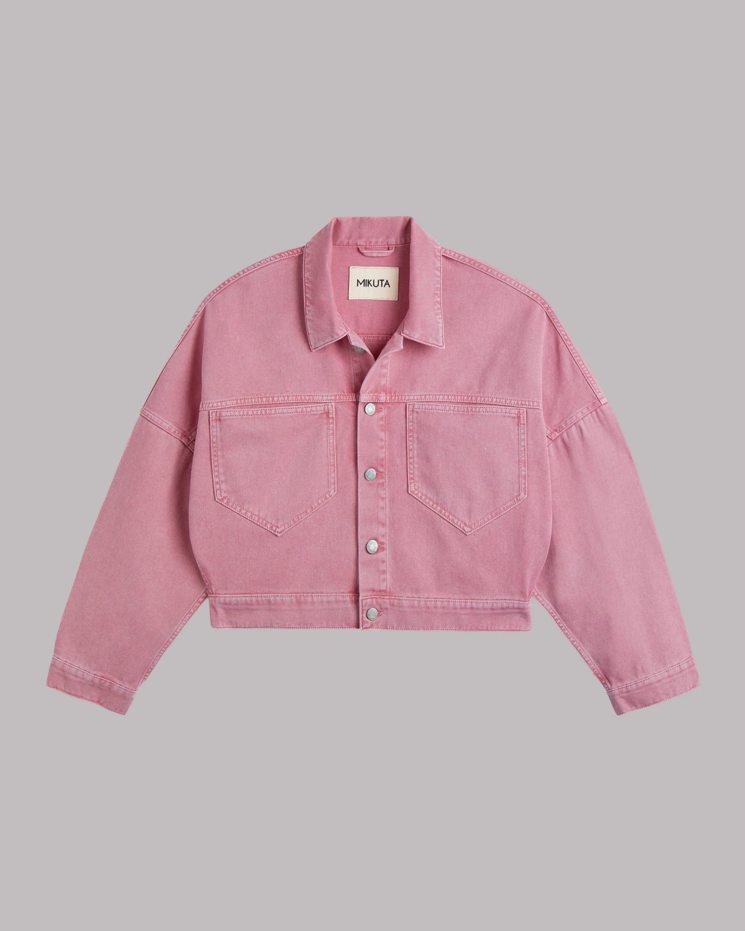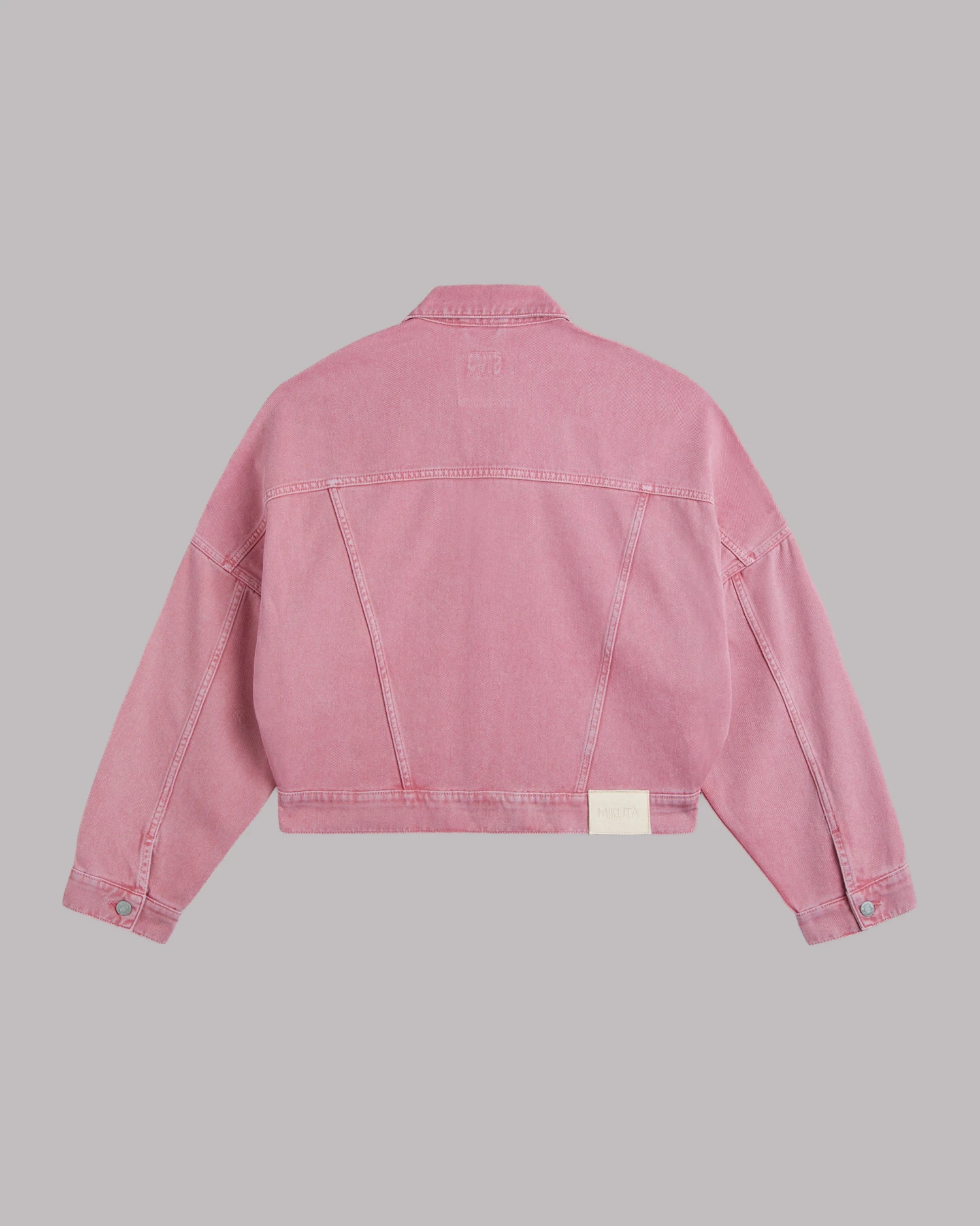 Oversized, bomber shaped denim jacket with dropped shoulders and extra long sleeves. Two big pockets on the front and a summary closure.