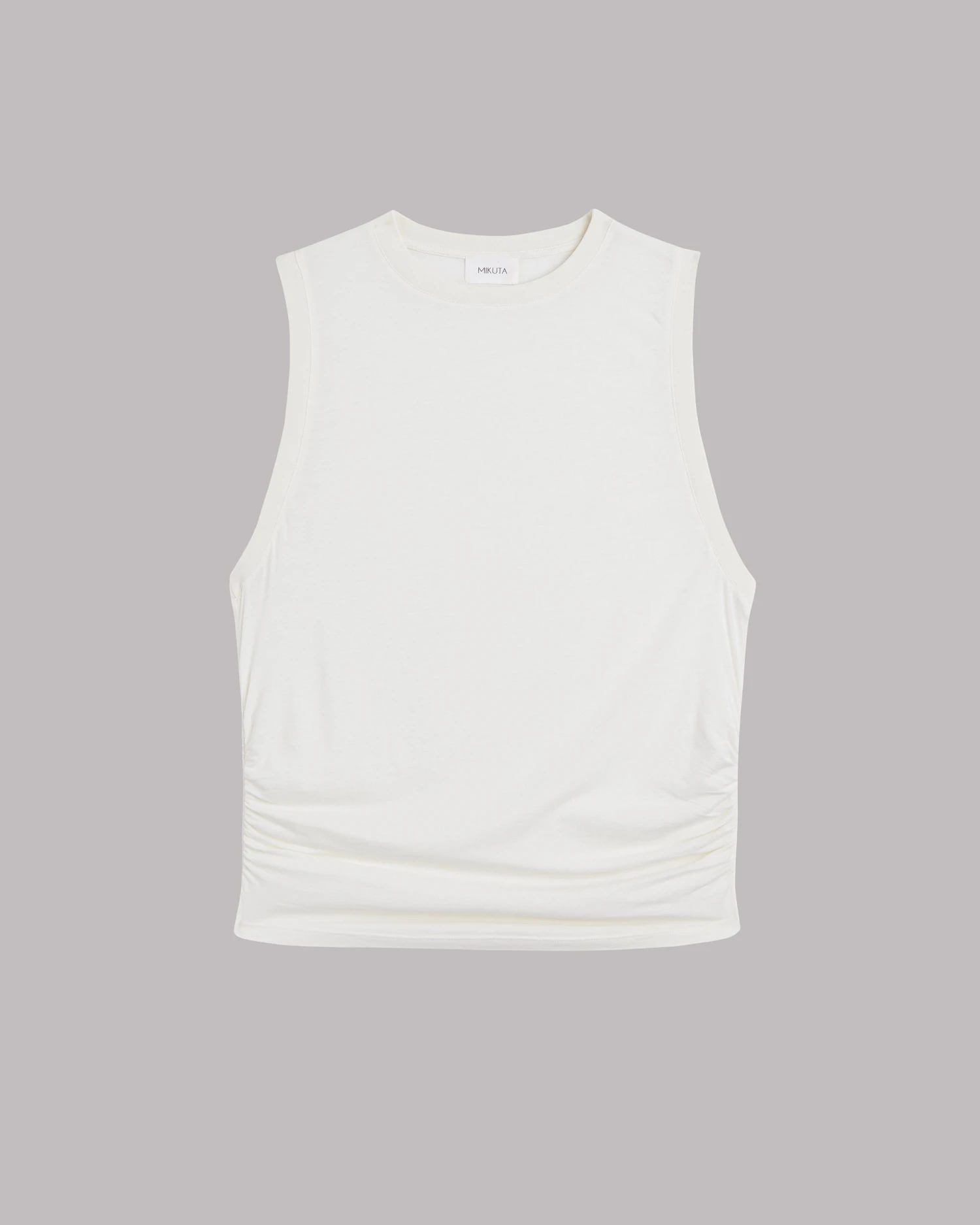 An everyday tank top in colorway white. Casually drape yourself in our softest lyocell blend fabric, held together with a seam that is perfectly cinched at the waist, a crew neckline, and cutoff sleeve design.
