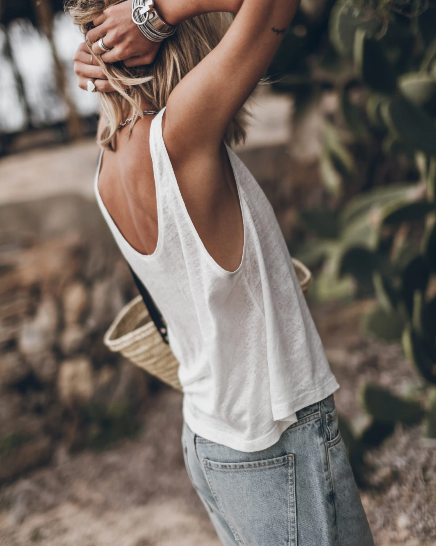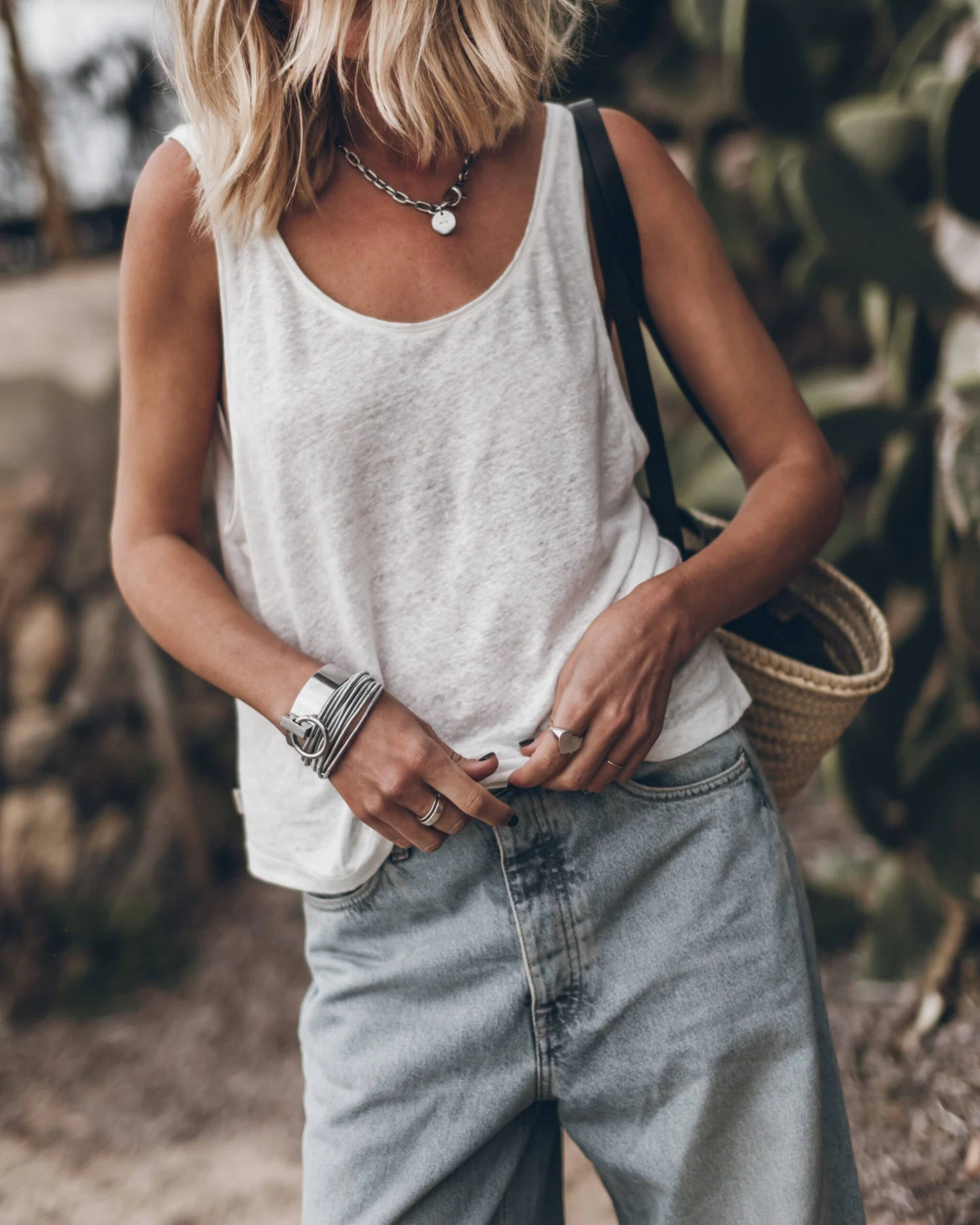 A go-to wardrobe essential for the warmer months, The White Linen Base Tank Top is a must-have for anyone who likes to keep it simple, yet wants to add a layer of elevated taste to the rotation. The summer staple that goes with everything.
